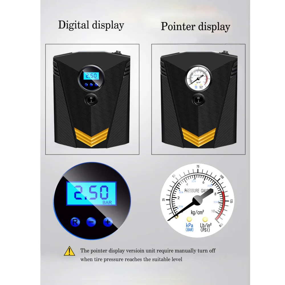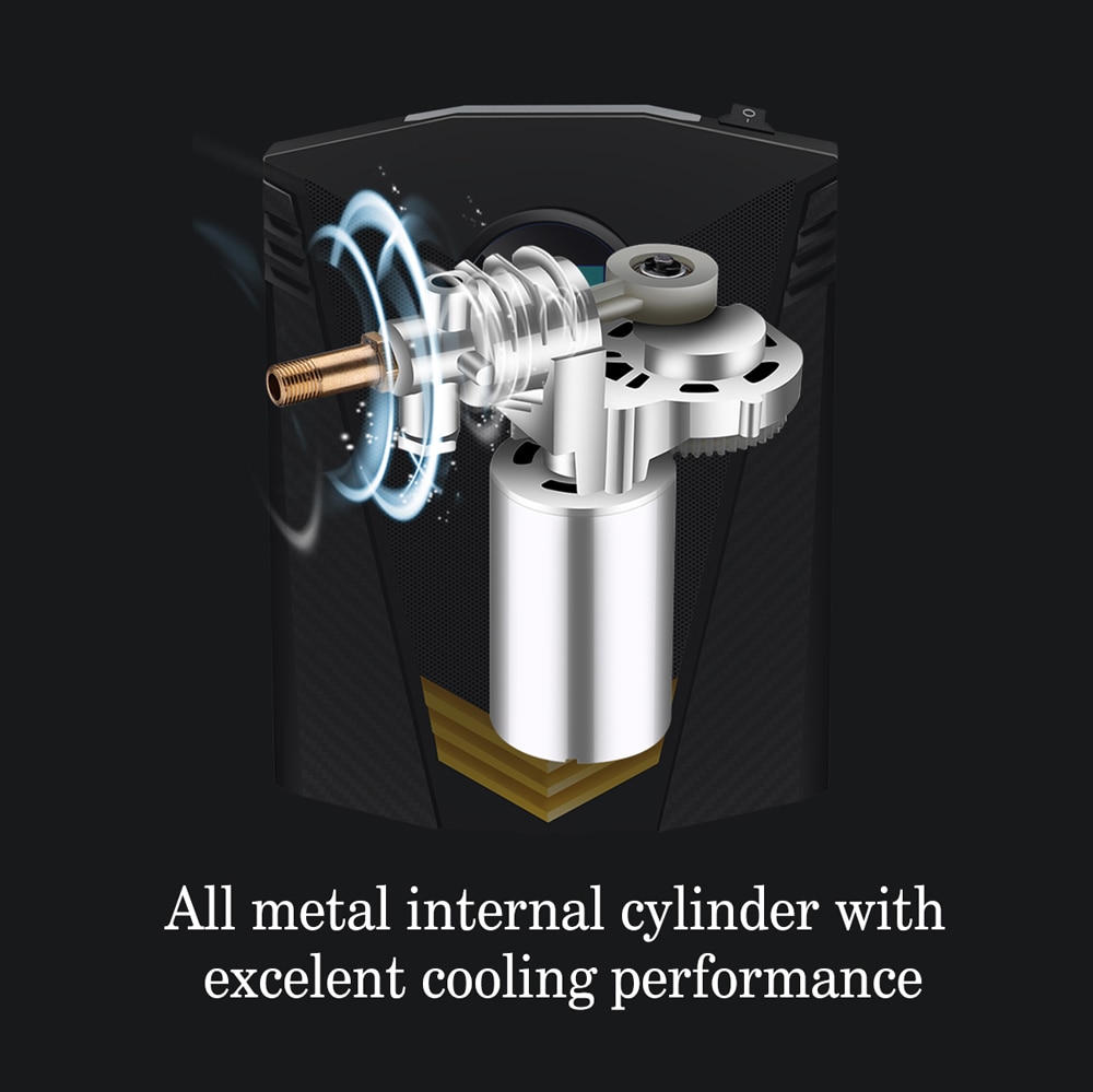 • Convenience 12V cigarette lighter plug power source which means you can inflate your tires on road.